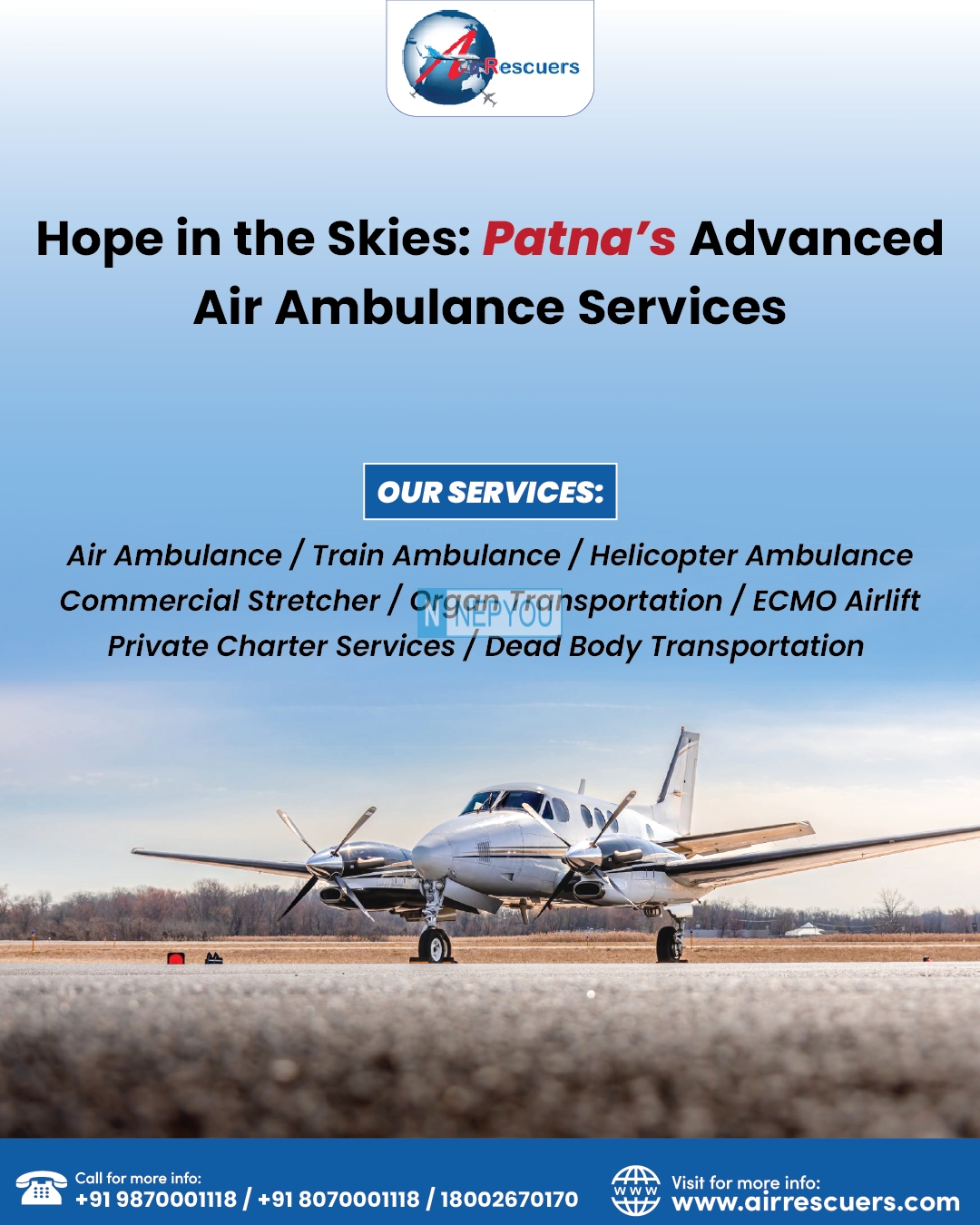 Delivers fast, safe, and reliable medical transport Air Ambulance Services in Patna with expert care in the skies—bringing life-saving support when every second matters.