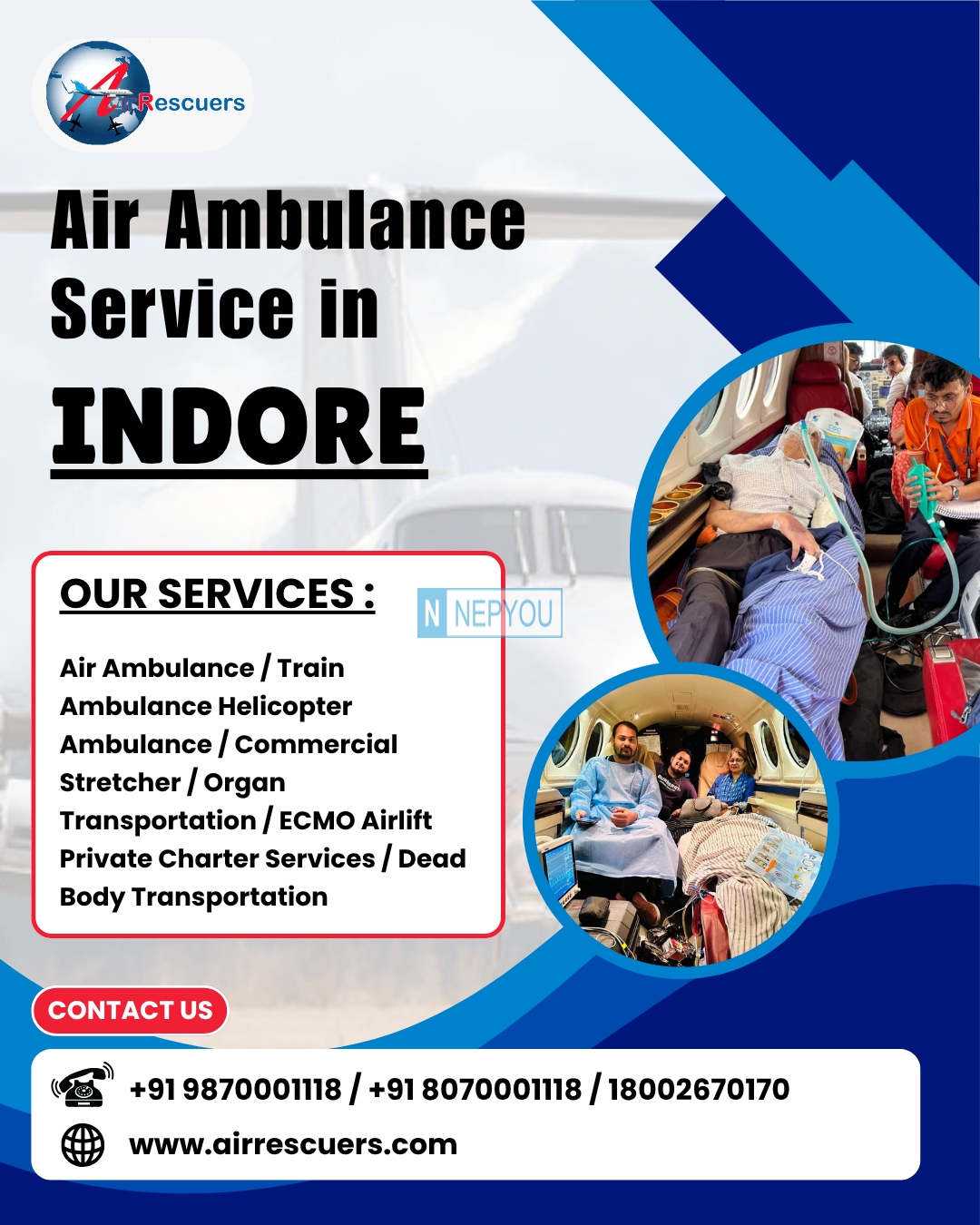We provide prompt and reliable Air Ambulance services in Indore, available 24/7 for emergency situations. Our aircraft are outfitted with advanced medical technology, and our experienced team guarantees exceptional care throughout the journey.
