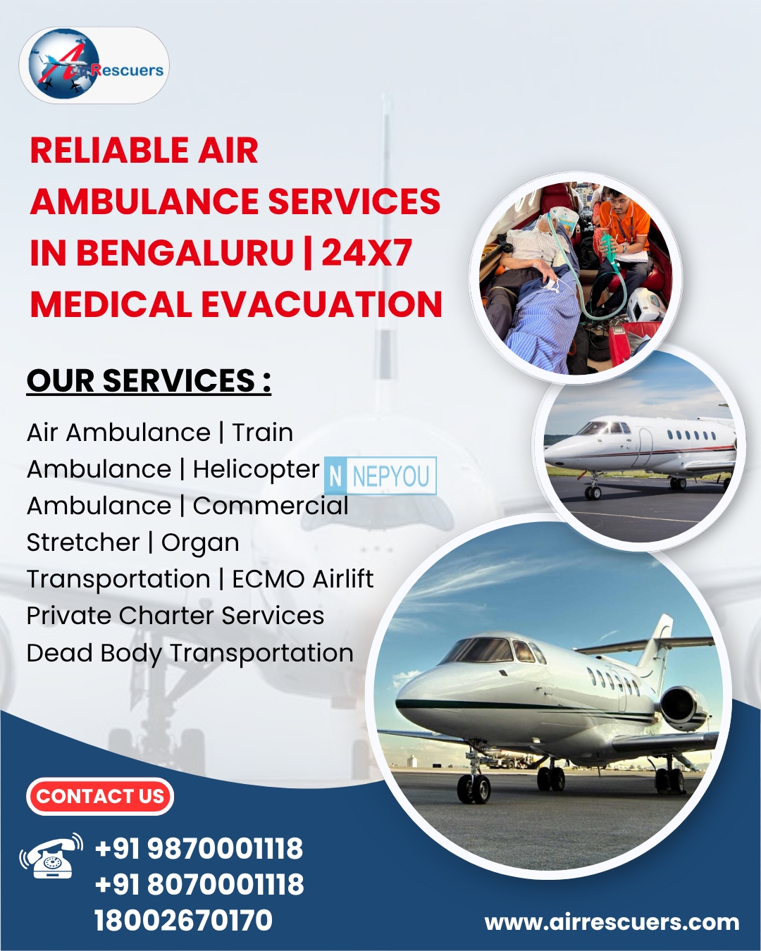 Need urgent patient transfer? Our Air Ambulance Services in Bengaluru provide fast, safe, and medically equipped flights for critical care patients. We operate 24/7 with experienced doctors, nurses, and paramedics onboard.